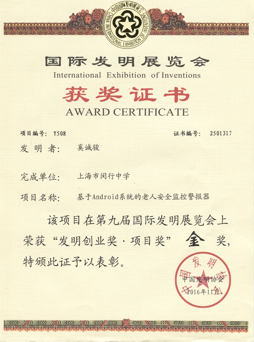 | 基于Android系统的老人安全监控警报器 | 龚诚骏 | 金奖 | 2016年 |