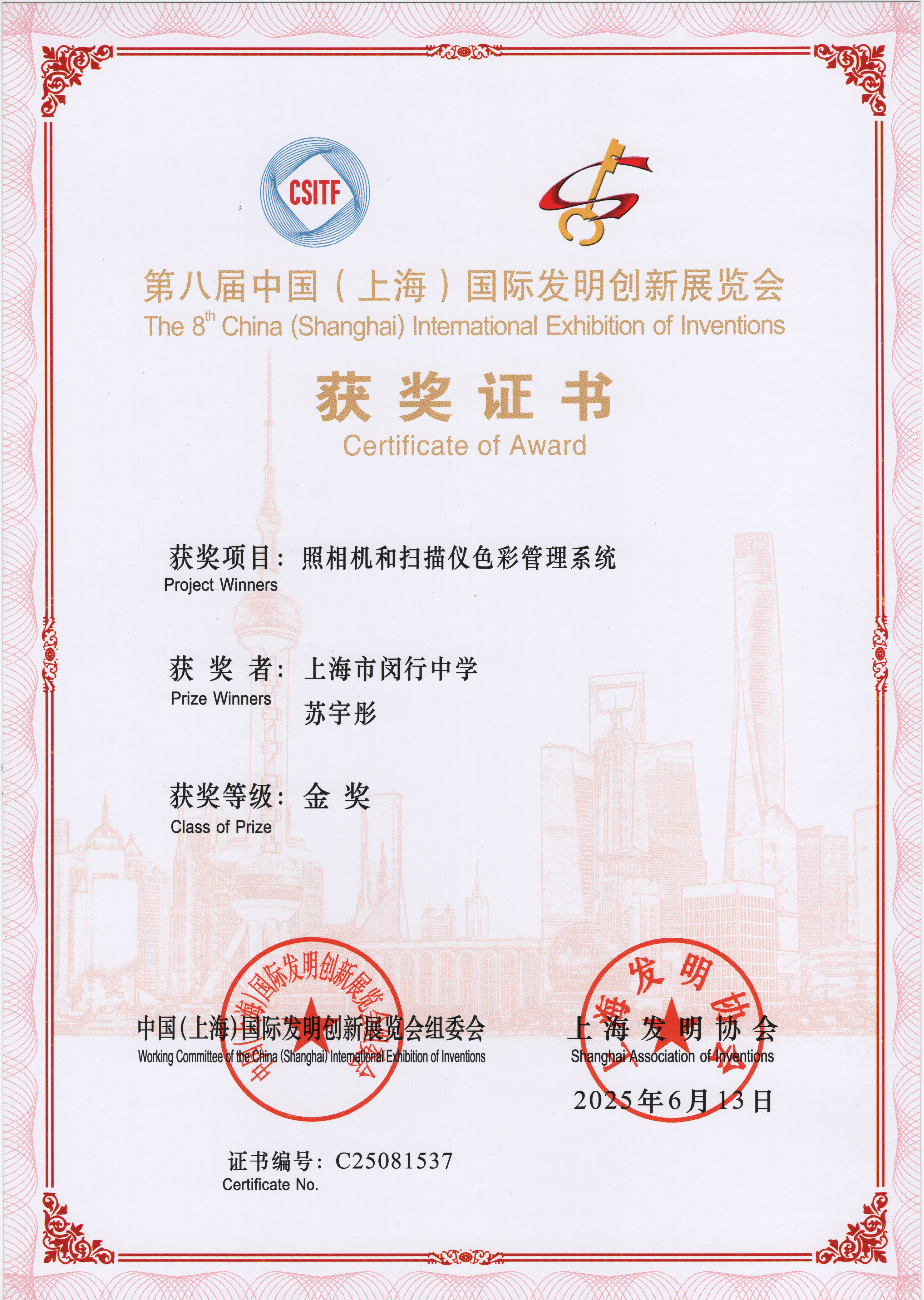 | 照相机和扫描仪色彩管理系统 | 苏宇彤 | 金奖 | 2025年 |